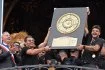 En ce dimanche après-midi, il a pu célébrer son exploit et le 22e titre du Stade Toulousain en communiant avec le public. Ici, aux côtés du maire Jean-Luc Moudenc, Romain Ntamack soulève le Bouclier de Brennus avec son capitaine et compère de la charnière Antoine Dupont.