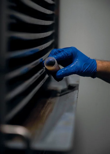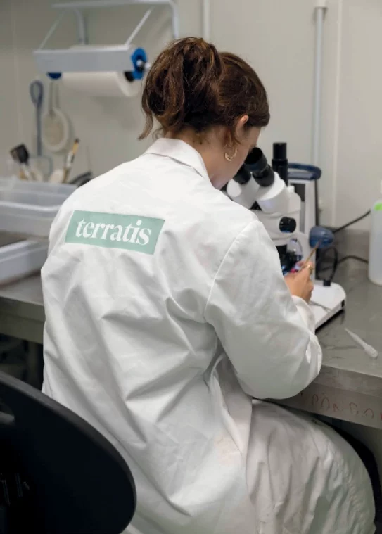 * Clelia Oliva, présidente fondatrice de Terratis. Elle contrôle la qualité des larves en salle d’élevage massif.