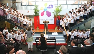 Car à Eurocampus, même si le français est la première langue enseignée, les quelque 600 élèves de 20 nationalités différentes parlent aussi couramment l’anglais et l’allemand. Sans oublier un enseignement qui fait « la part belle aux arts plastiques et à la musique », a ajouté Ulrike (…)