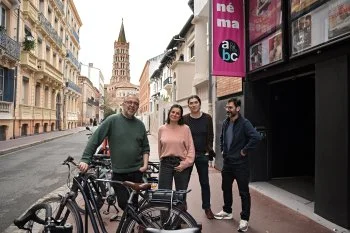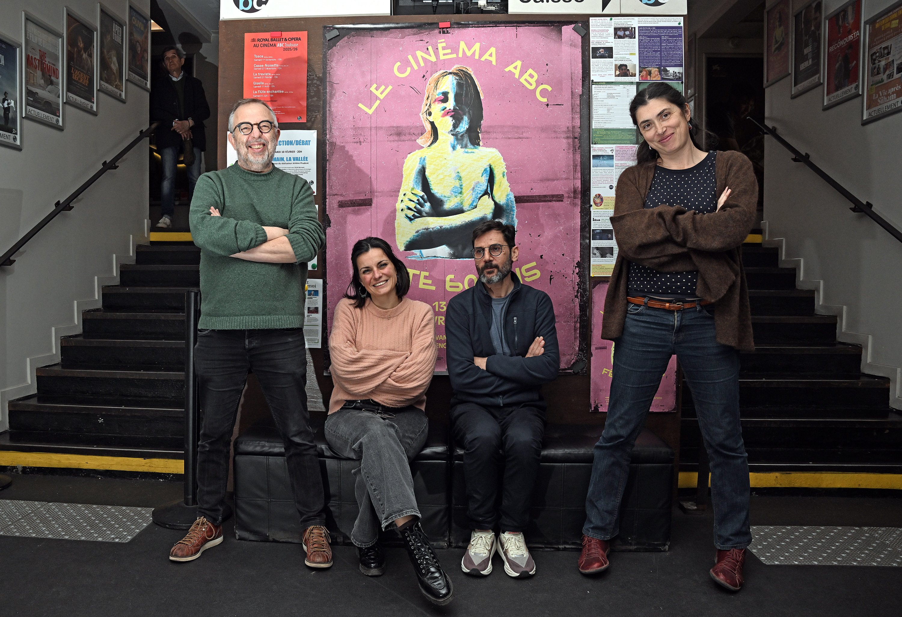 Sur la photo : Le dirigeant de la jeune Scop qu’est devenue le cinéma ABC, accompagné de trois autres associés de la structure : Gaëlle Bonnemaison, chargée de communication, Stéphanie Bousquet, programmatrice jeune public-coordinatrice École et Cinéma, et Simon Pic, chef opérateur-projectionniste. Crédit : Rémy Gabalda-ToulÉco.