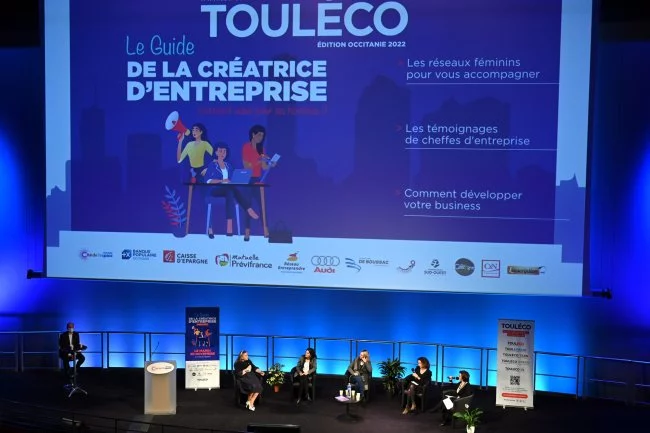 Sur la photo de une : De gauche à droite, Carine Rouvier, la présidente de l’association Femmes chefs d’entreprises (FCE), Sandrine Jullien-Rouquié, la présidente de la French Tech Toulouse, Pascale Bueno-Mérino, chercheuse à TBS Éducation, et Julie Khaski, directrice d’Investissement chez M Capital, ont répondu à la Cité de l’espace aux questions de la journaliste de ToulÉco Béatrice Girard, rédactrice en chef du Guide de la créatrice d’entreprise.Crédit : Rémy Gabalda - ToulÉco.