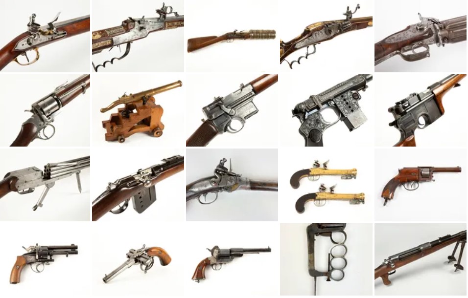 Carabine Bergmann 1897 calibre 7,8 mm Bergmann première version, certainement le seul exemplaire gravé connu et identifié. Extraordinairement rare prototype d’un révolver Le Mat en double action. Extraordinaire et probablement unique fusil de salve à huit canons. Sublime petite arquebuse à rouet du premier tiers du XVII° siècle par Hieronymus Borstorffer à Munich, armurier des Princes électeurs de Bavière Maximilian et Albrecht Belle espingole de Marine bronze modèle 1840 règlementaire.